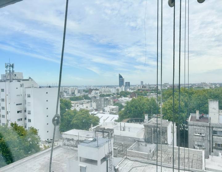 Apartamento en Miguelte y justicia en primer piso por escaleraLiving comedor con cocina integrada . terraza